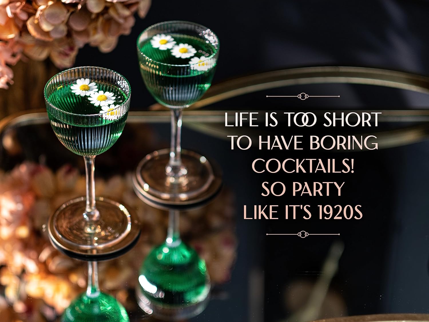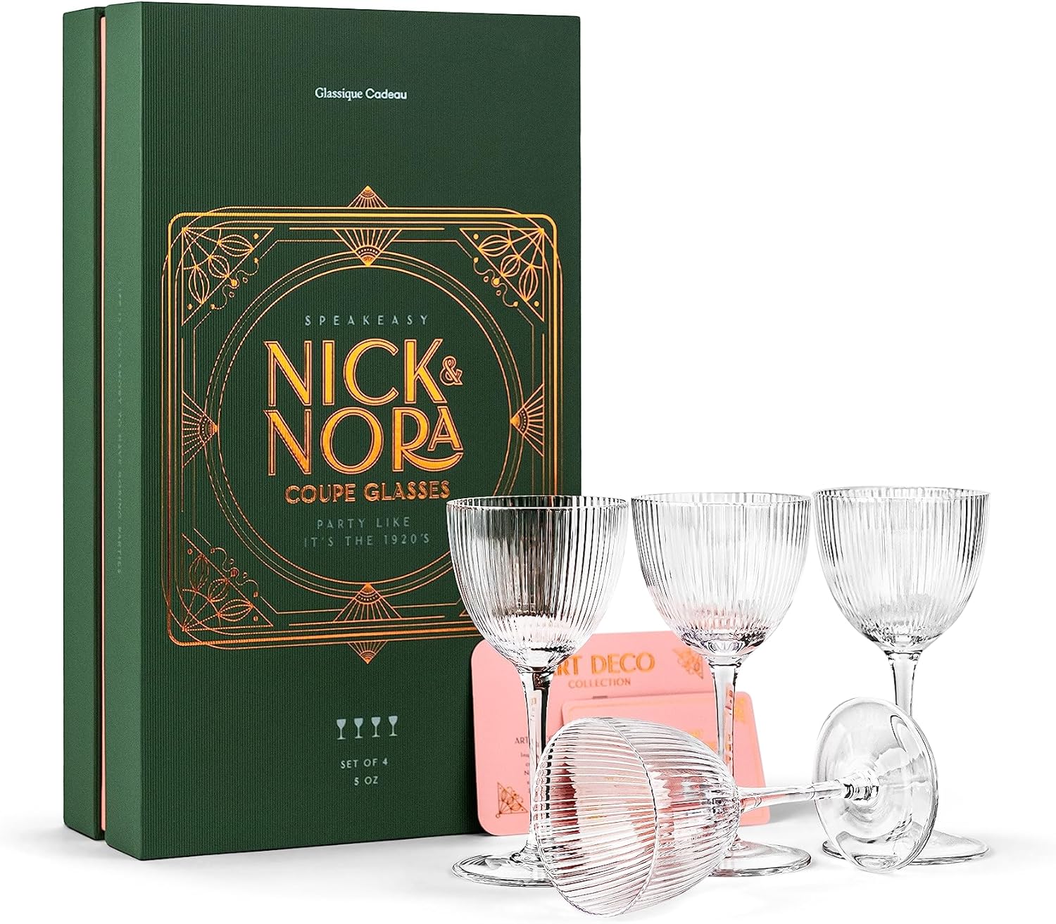 Ahhhh Art Deco.. perhaps the most beautiful of all period design styles. Geometric, rectilinear, glorious. Named after the Nick and Nora Charles films (played by William Powell and Myrna Loy- “ The Thin Man “ series ) these charming coupe stemware are perfect for martinis, daiquiris, manhattans or any of a myriad of period cocktails. Hand blown from fine crystal glass, these seamless 5 ounce geometric ribbed coupe glasses have substantial Art Deco charm. Beautiful, Elegant, Sophisticated. As a perfect host/hostess gift they come in a beautiful well made period type box with classic cocktail recipes on the back. (Also great for storage) My new go-to host/hostess gift. I love them!!