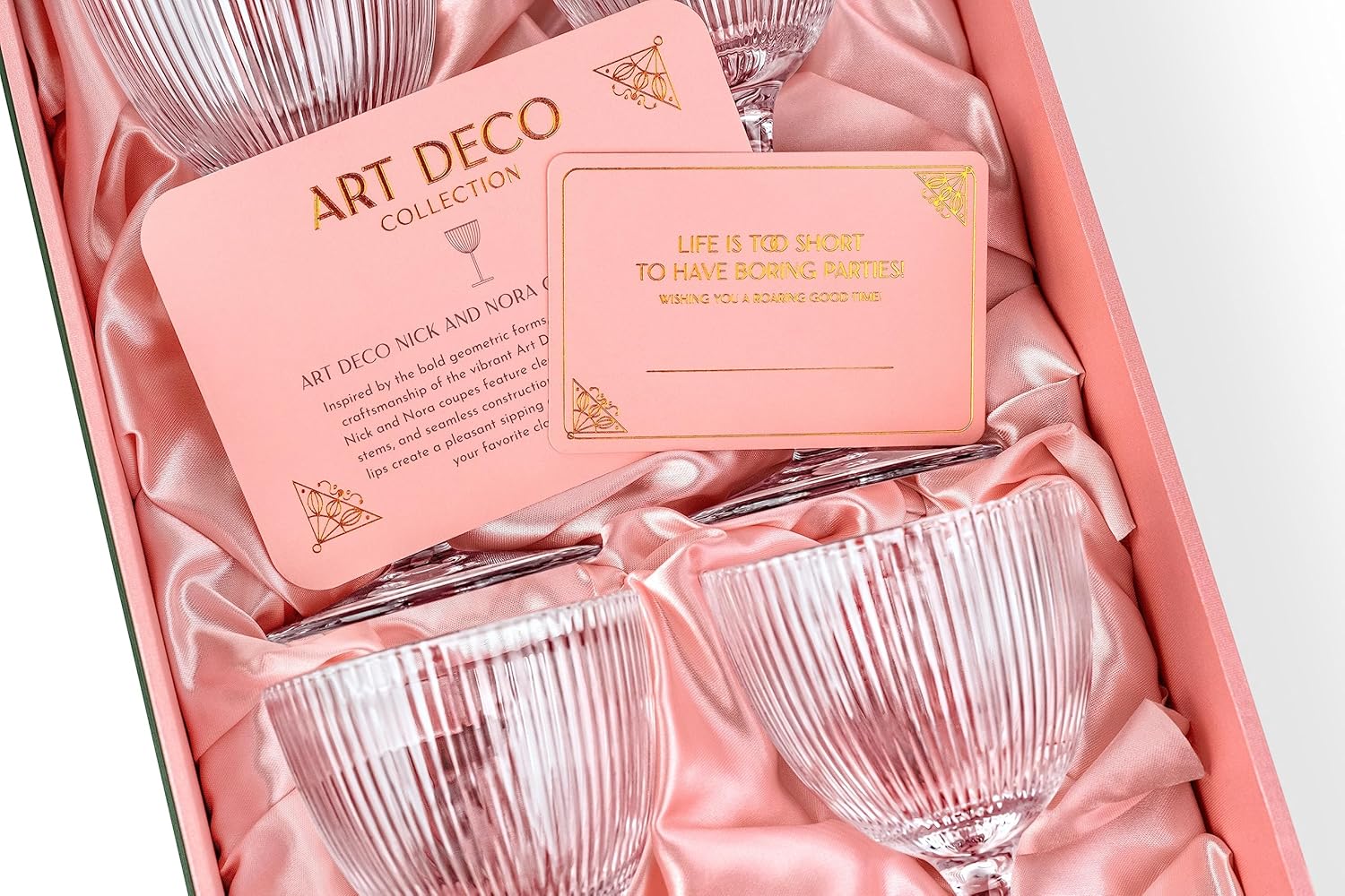 6.26.23~ Between you & me~ when I saw a box of glasses, was shipping with some not so gentle things, got a bit nervous. Then they arrived. Perfectly. The way 'Glassique Cadeau' packed, you could drop from a 2 Story bldg & be fine. It comes in a Gatsby Green, ribbed cardstock covered box that feels like wood. Inside it's packed top & bottom in 4" of black velvet lined foam, wrapped in pink satin. Don't think I've used this word to describe anything online but it looks Exquisite. The glasses equally match the presentation. Especially when you realize the box ribbing is a nod to the grooved glasses. The most impressive detail about the glasses is the base. It's wider than the bowl/glass which respects its 1920/40's inspiration. It's just a great detail if you appreciate little things. Just don't know how this is under 40 at the current price. These look & feel like each is a $20 cordial, or old school martini glass. The are a bit heavy which alludes to its value but holding it feels you're on a Luxury Ocean Liner. I admit my love of 'An Affair to Remember' may be getting the better of me. Just love a simple coupe-style glass you can talk with your hands & not spill. It's 5 oz so perfect for port, cordial or a gimlet. Also perfect to gift & ship. Enjoy.